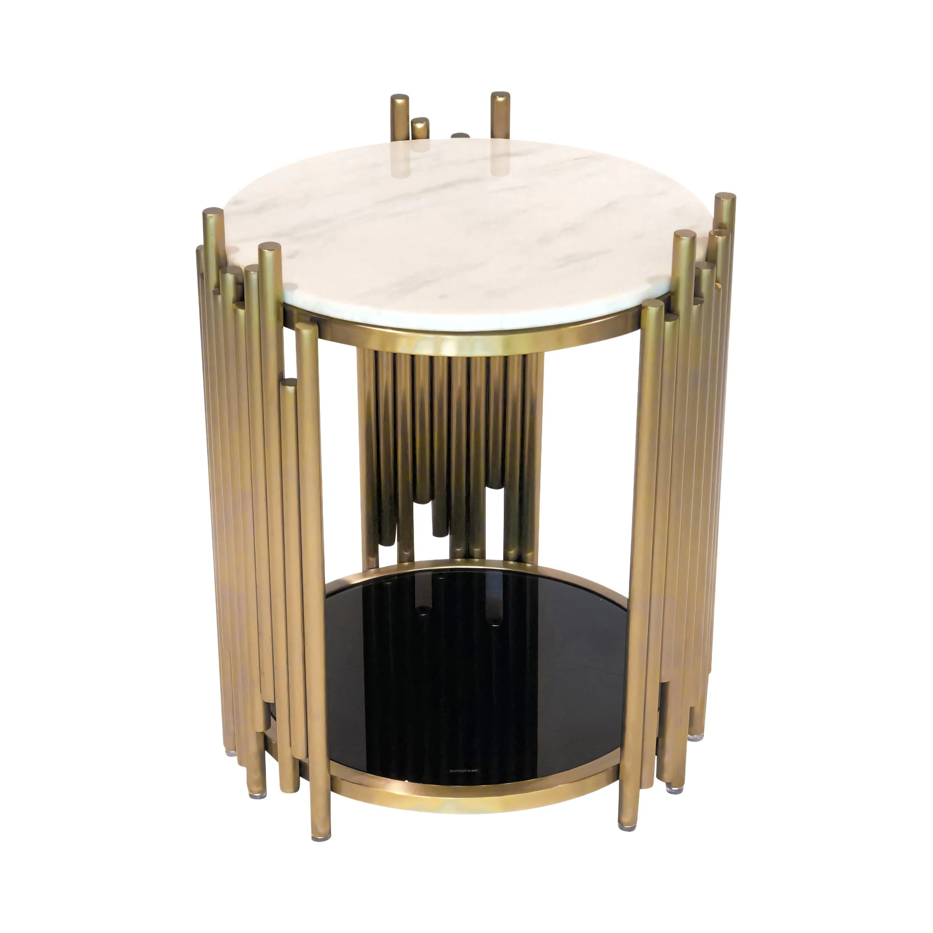 The DYNASTY Faux Marble Side Table seamlessly integrates luxury with practicality. Its pristine faux marble top exudes an aura of elegance, while the contrasting golden rods create an arresting visual that captivates any room's ambiance.