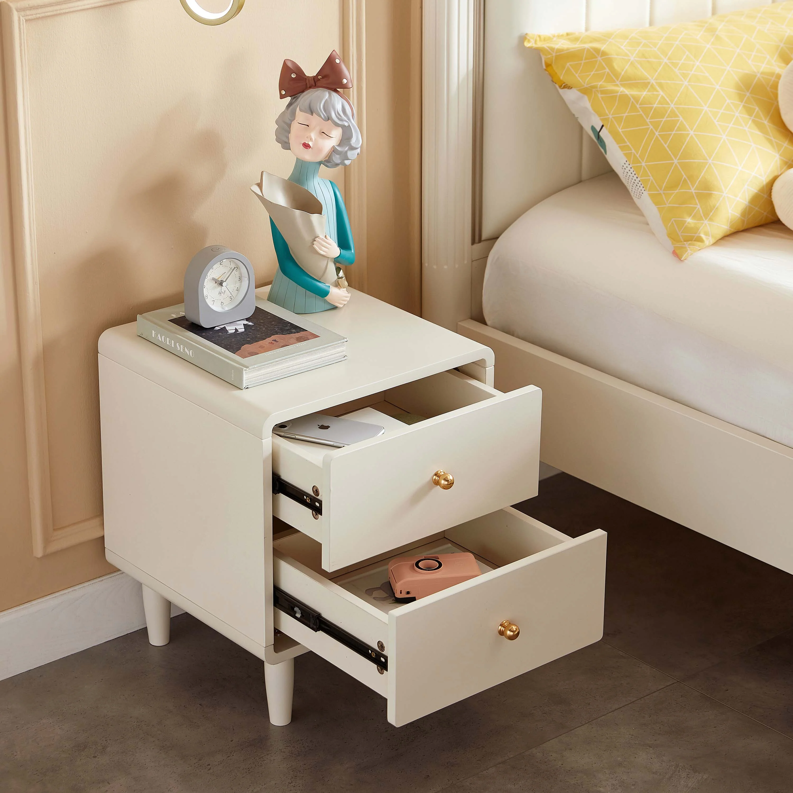 Elevate your bedroom ambiance with Elara, the nightstand that masterfully combines safety and elegance. Crafted with a calming cream hue, this nightstand features gently curved corners, ensuring a child-friendly design without compromising on style. The shimmering golden knobs radiate luxury, while the two spacious drawers keep your essentials organized and within easy reach. Its robust, tapered legs guarantee longevity and a sound foundation.
