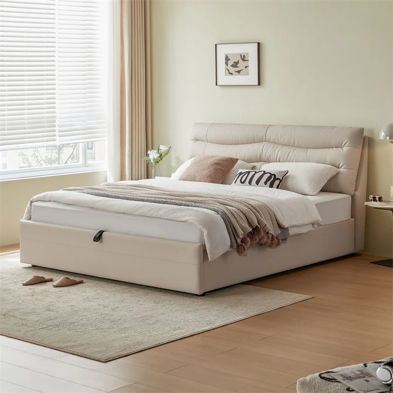 This luxurious bed features a gas-lift hydraulic storage system, offering convenient under-mattress space to keep bedding, clothes, or personal items neatly stored. The padded headboard provides extra comfort, perfect for sitting up to read or relax. Its modern, sleek design makes it a stylish addition to any bedroom.
