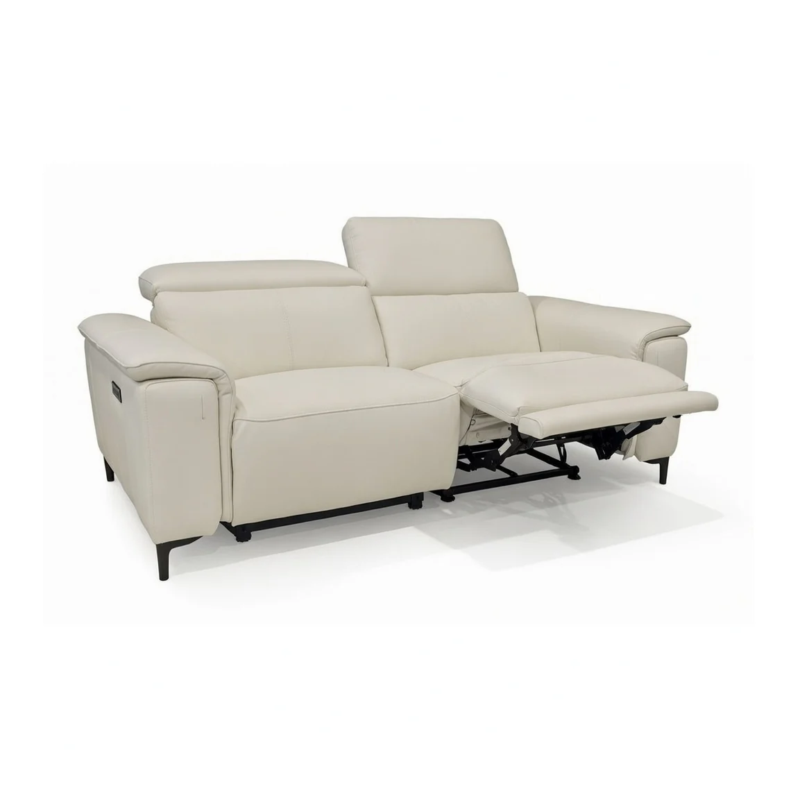Smooth frost white leather wraps this modern sofa, offering a sleek yet inviting look for your living room. With adjustable headrests, it provides personalized comfort for relaxation or entertainment. The power motion recliner ensures ease of use with a seamless recline at the touch of a button.
