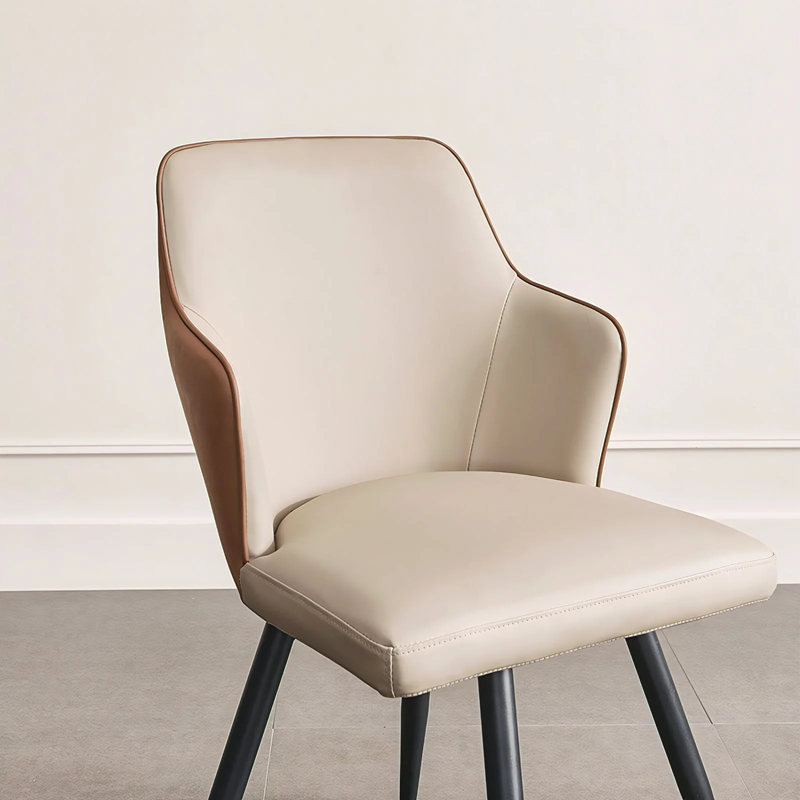 This dining chair exudes a modern charm with its sleek silhouette and two-tone design. The creamy beige upholstery gracefully contrasts with the rich, dark hue of the legs, creating an elegant yet understated aesthetic. Its minimalistic style blends sophistication with functionality, perfect for contemporary dining spaces.