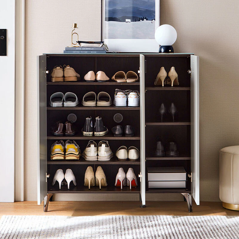 Sleek and multifunctional, this shoe cabinet is an elegant solution to keep your entryway clutter-free. Its contemporary design, with a tempered glass tabletop, allows for a stylish display or handy placement for daily essentials. The contrast between the dark wood compartments and the light exterior adds a modern edge to any decor.