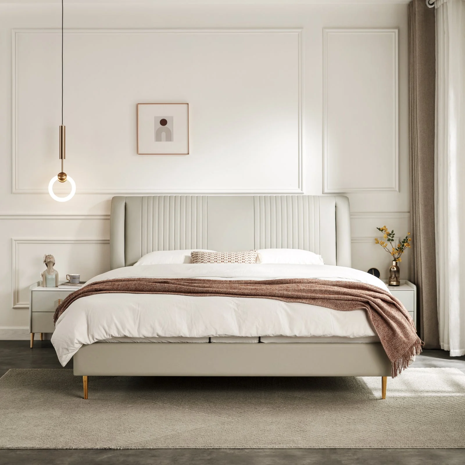 Whether you choose the warm beige or the classic grey, each color adds a serene and upscale feel to your space. This bed is not only a statement piece but also a testament to timeless design and comfort, suitable for a range of interior styles. Elevate your bedroom with this stylish and comfortable upholstered bed frame. This platform bed offers both elegance and relaxation.
