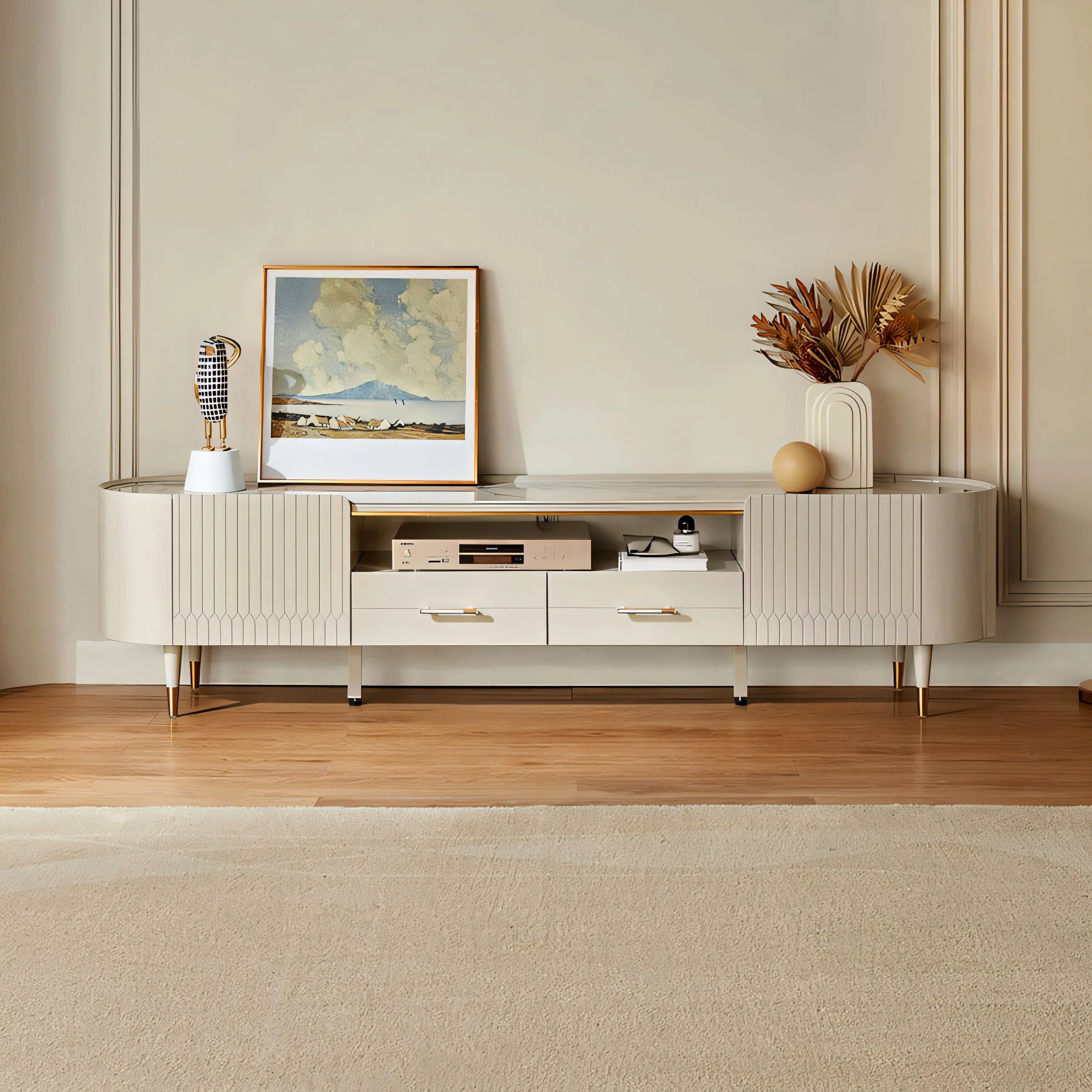 The warm apricot hue adds vibrancy to your space while its versatile design seamlessly fits various decor styles. Crafted for durability, this stand provides a stable and organized platform for your TV and media accessories.